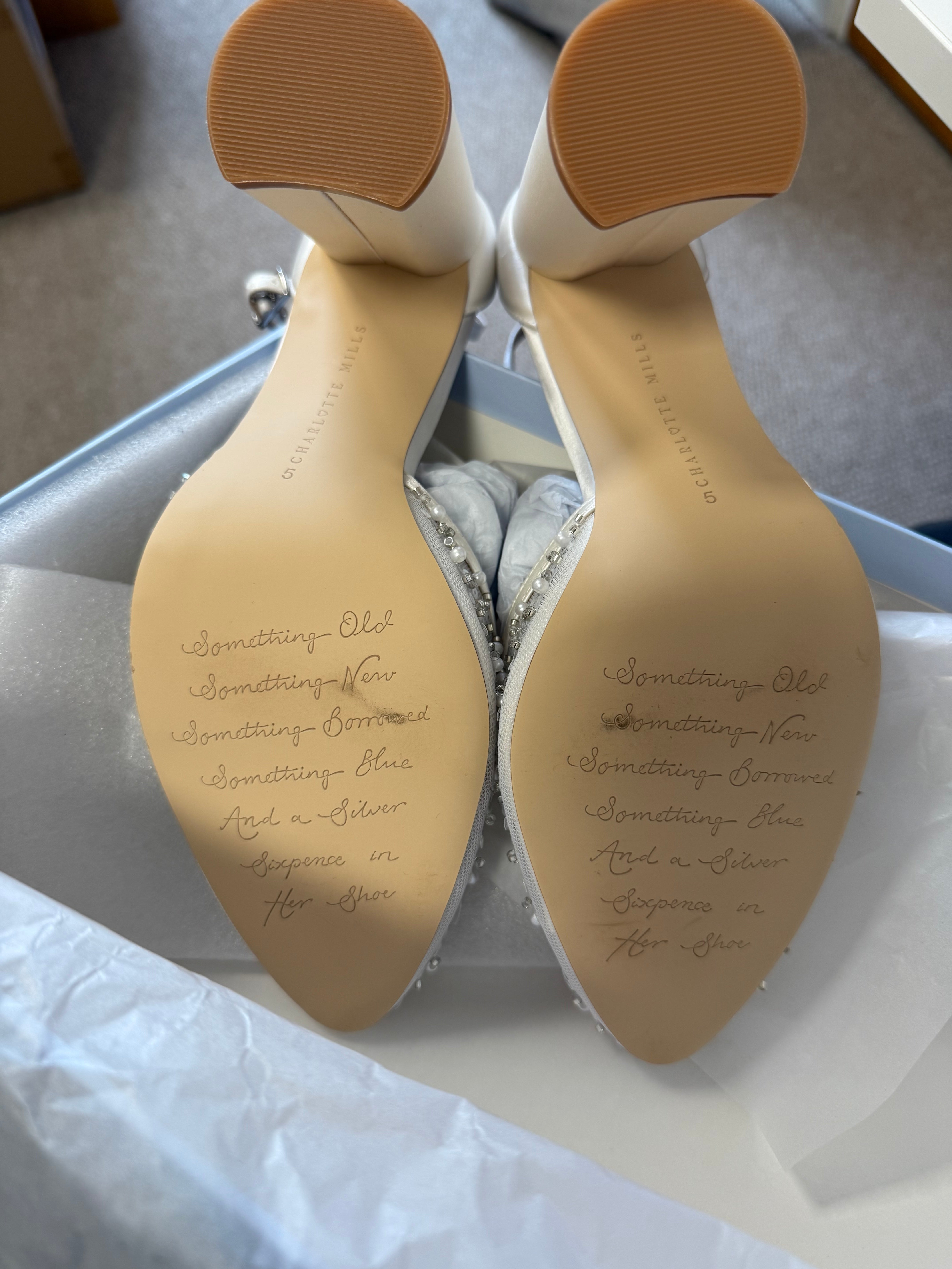 • Delicate ivory satin back counter and supportive ankle strap to ensure a secure fit.