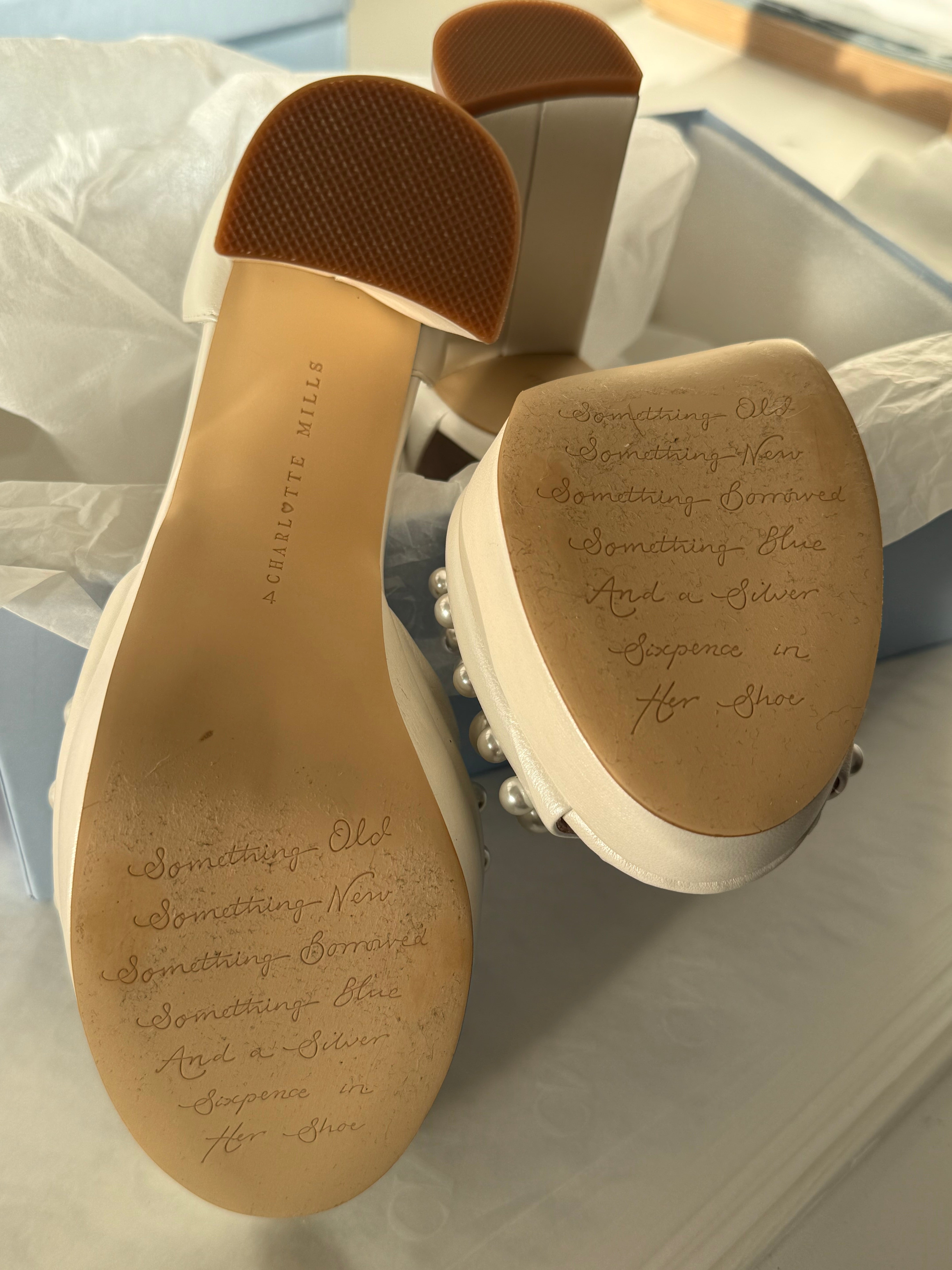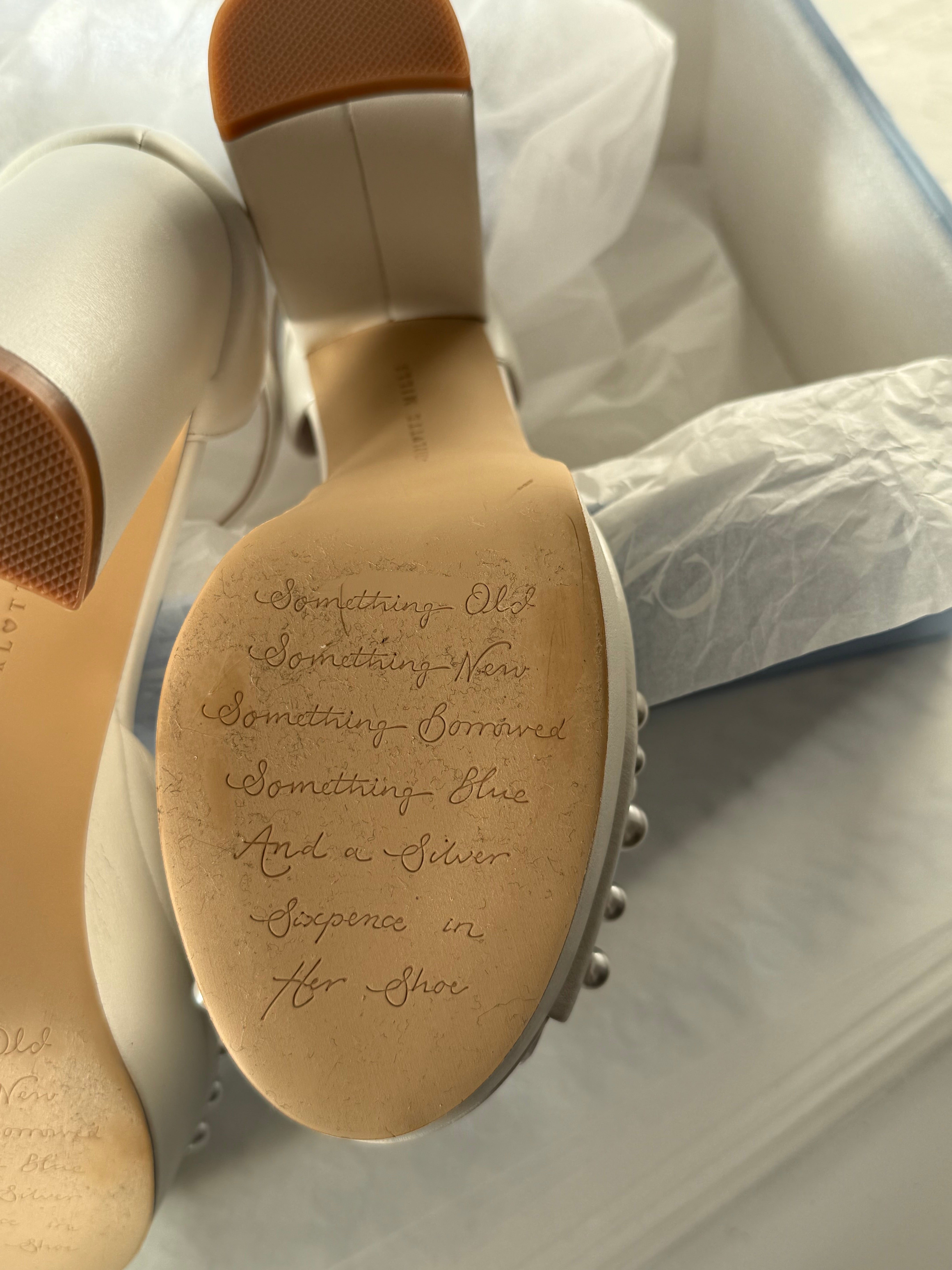 Sole: Embossed with the phrase “Something old, Something new, Something borrowed, Something Blue and a silver sixpence in her shoe.”