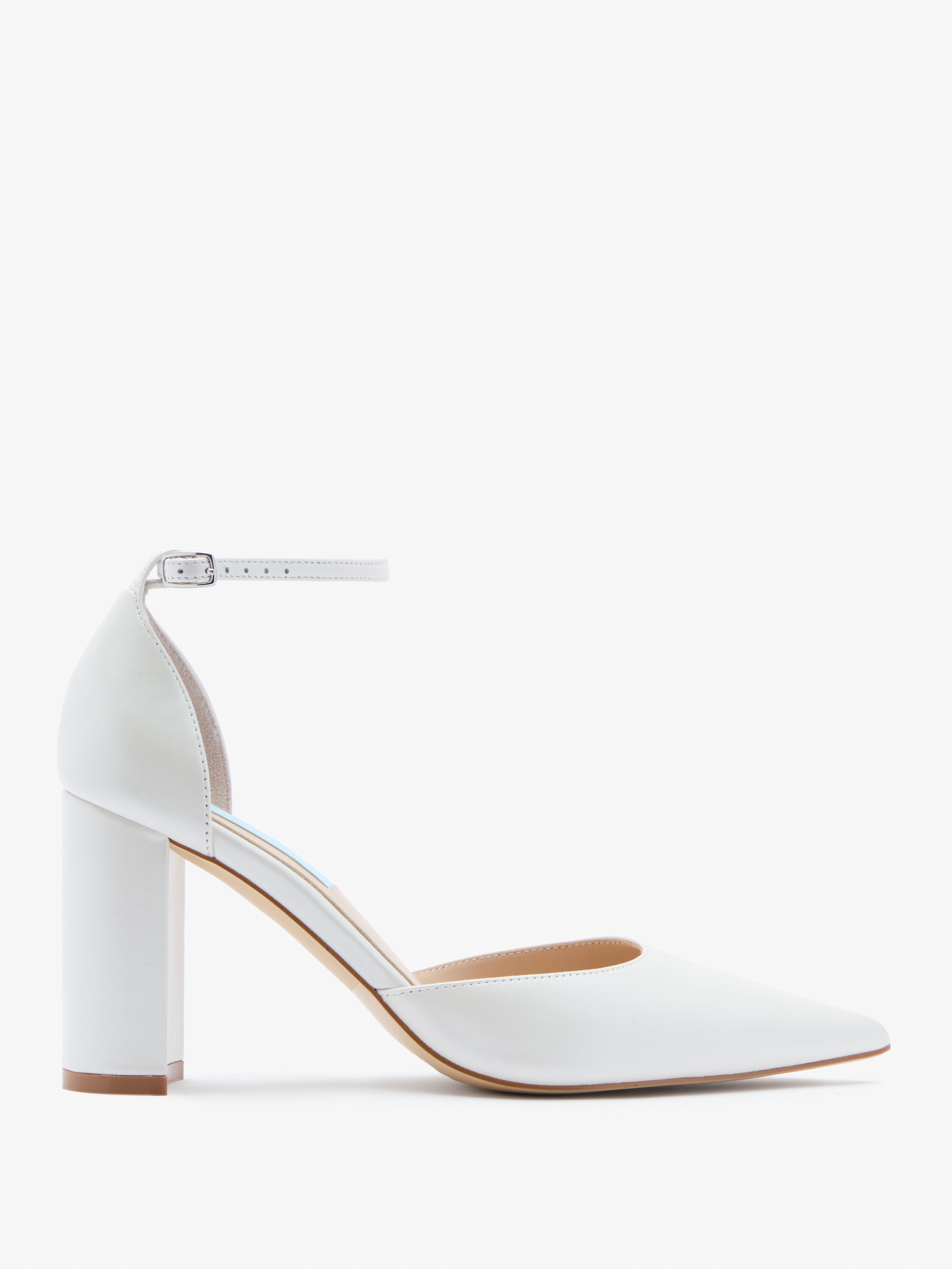 Pointed-toe bridal heels with a block heel and interchangeable straps.