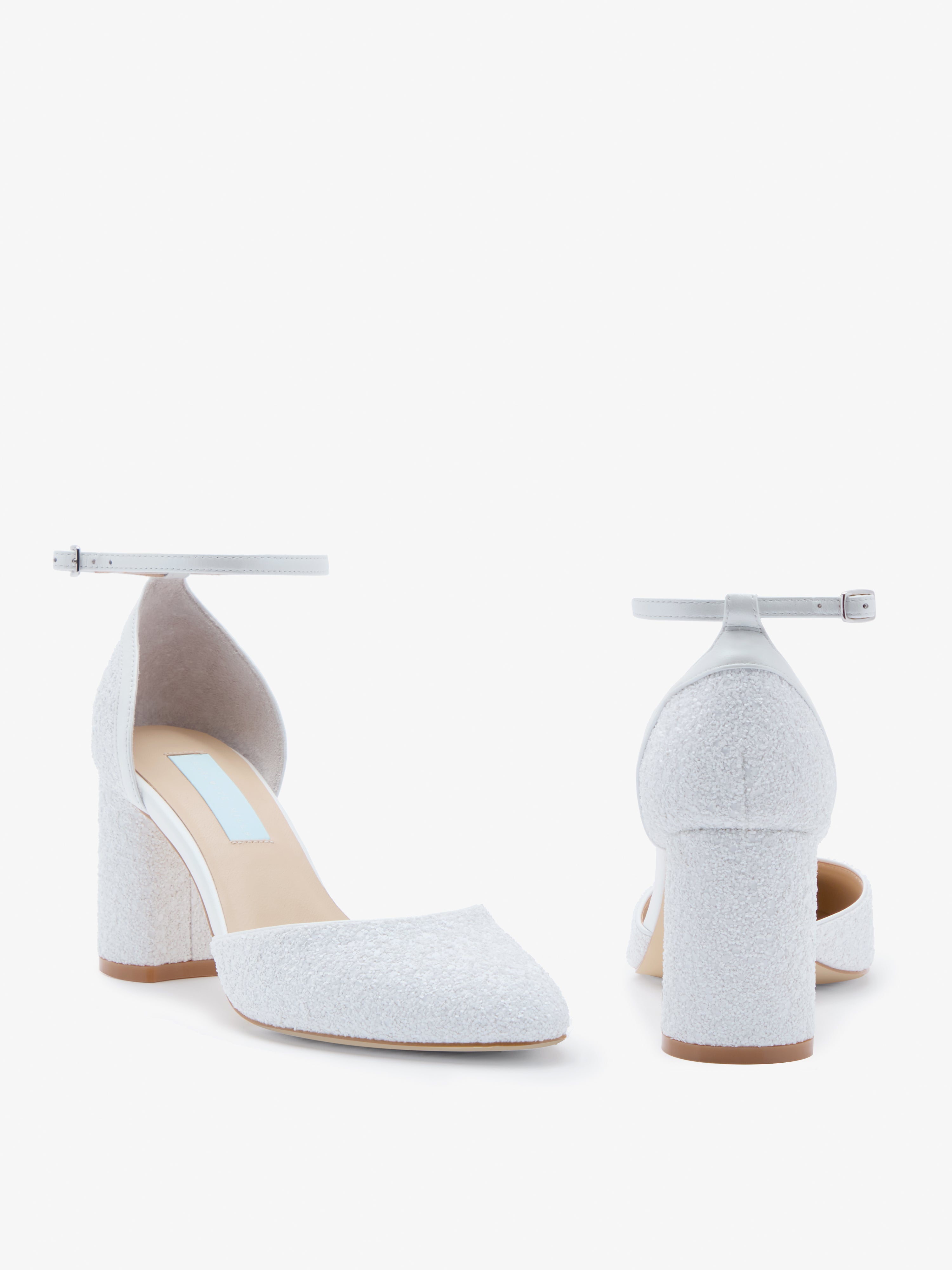 Ivory almond toe crushed-pearl glitter bridal block heels.