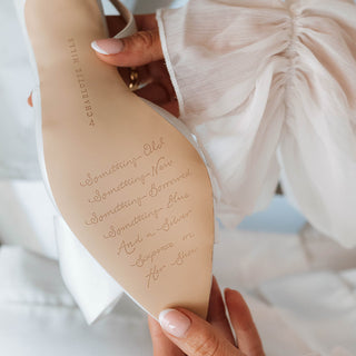 Sole: Embossed with the phrase “Something old, Something new, Something borrowed, Something Blue and a silver sixpence in her shoe.”